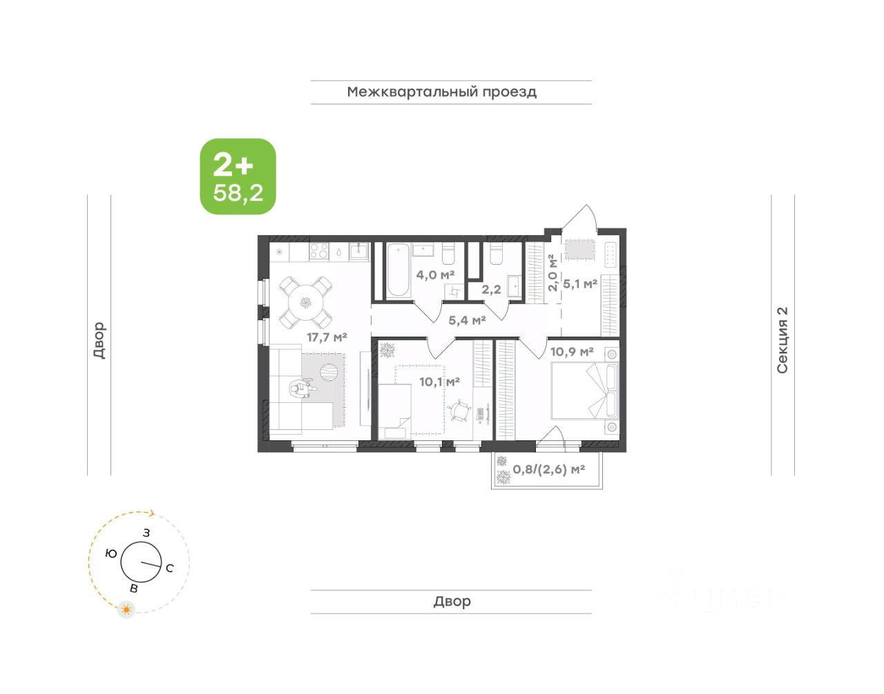 Просторная евро-планировка с окнами на две стороны света — идеальное решение для семьи, ценящей свет и пространство. Площадь 58,2 кв.м. с двумя спальнями, двумя санузлами, кухней-гостиной и продуманным зонированием. Потолки 2,7 м. Объединенная кухня-гостиная 17,7 кв.м. — пространство для готовки, общения и семейных ужинов за общим столом. Две отдельные спальни обеспечивают комфорт и личное пространство. Два санузла, один из которых оснащен зоной под стиральную машину. Гардеробная 2 кв.м. — удобное место для хранения и организации вещей. Планировка, в которой приятно проводить время с семьей.