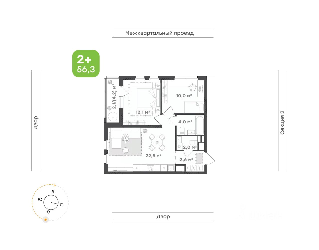 Общая площадь 56,3 кв.м. с двумя отдельными спальнями и двумя санузлами — подходящий вариант для семьи с ребенком.