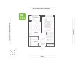 Площадь 34 кв.м. с удобной планировкой: отдельная спальня, кухня и дополнительное место для хранения.