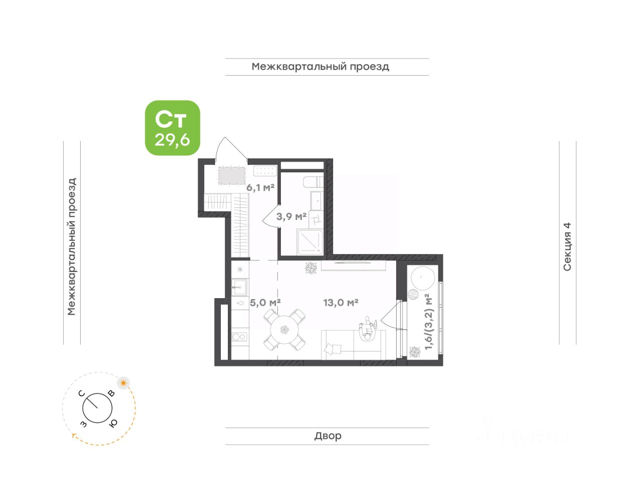 Площадь 29,6 кв.м. с возможностью зонирования на зону отдыха и кухню.