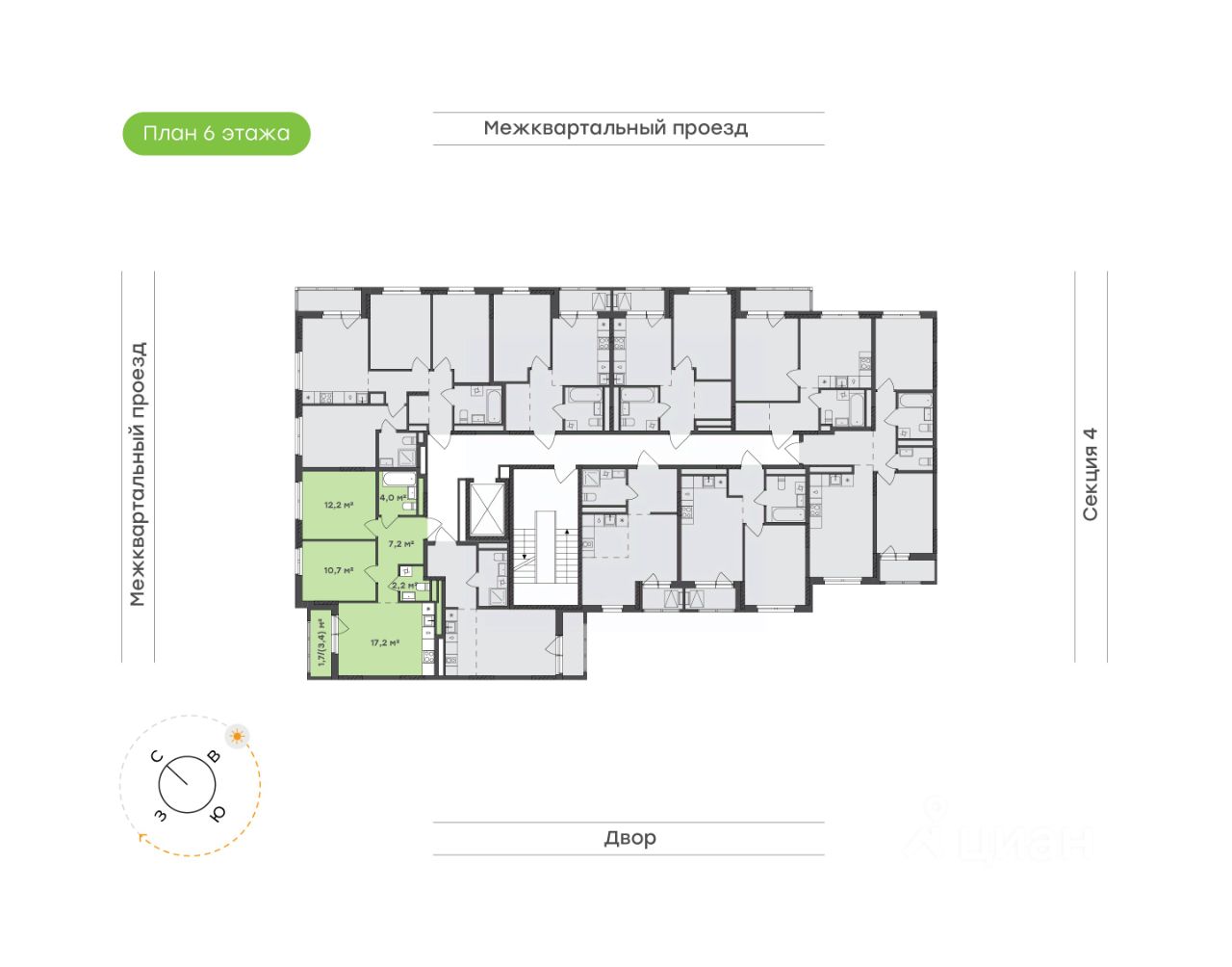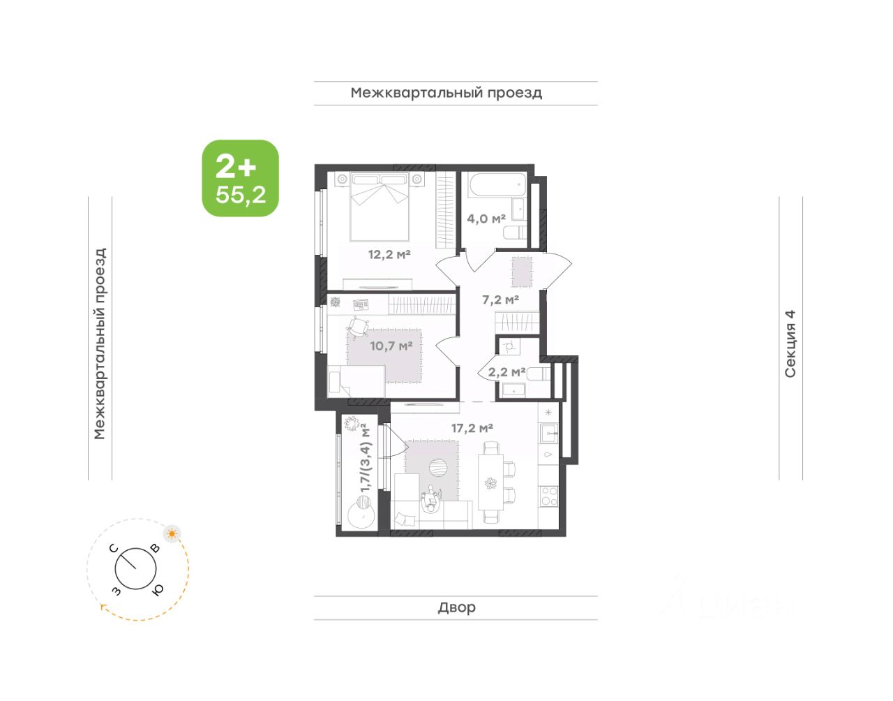 Общая площадь 55,2 кв.м., включая собственную гардеробную комнату.