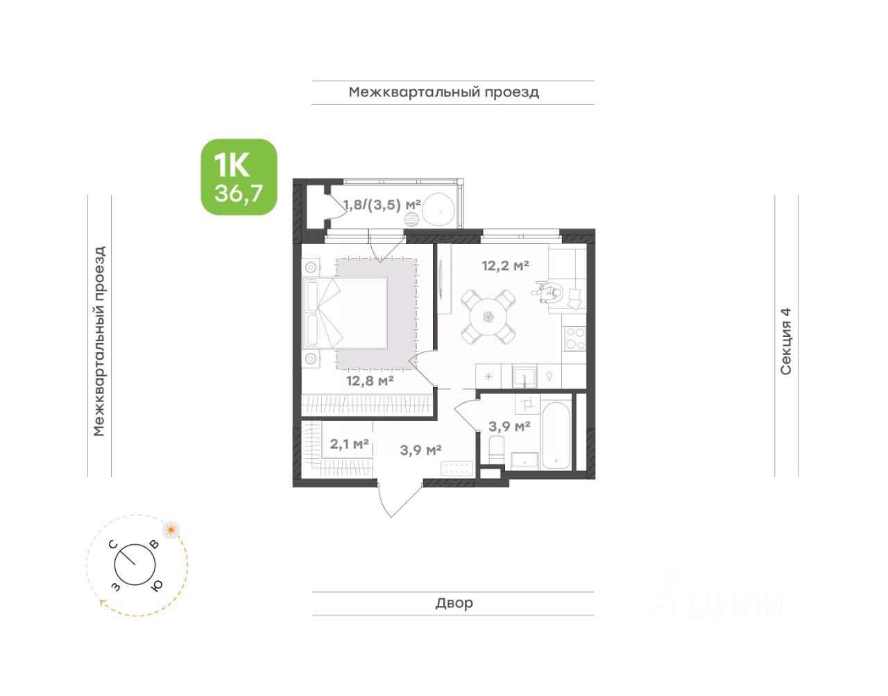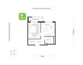 Площадь 36,7кв.м. с объединенной зоной кухни, столовой и гостиной, а также отдельная спальня.