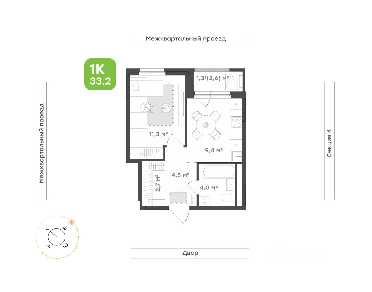 Площадь 33,2 кв.м. с классической планировкой: изолированная спальня и кухня.