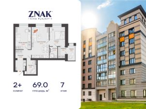 Продается 2-комнатная квартира площадью 69.00 кв. м. с предчистовой отделкой. Квартира находится в жилом комплексе комфорт-класса ZNAK, расположенном в районе ул. Берша.