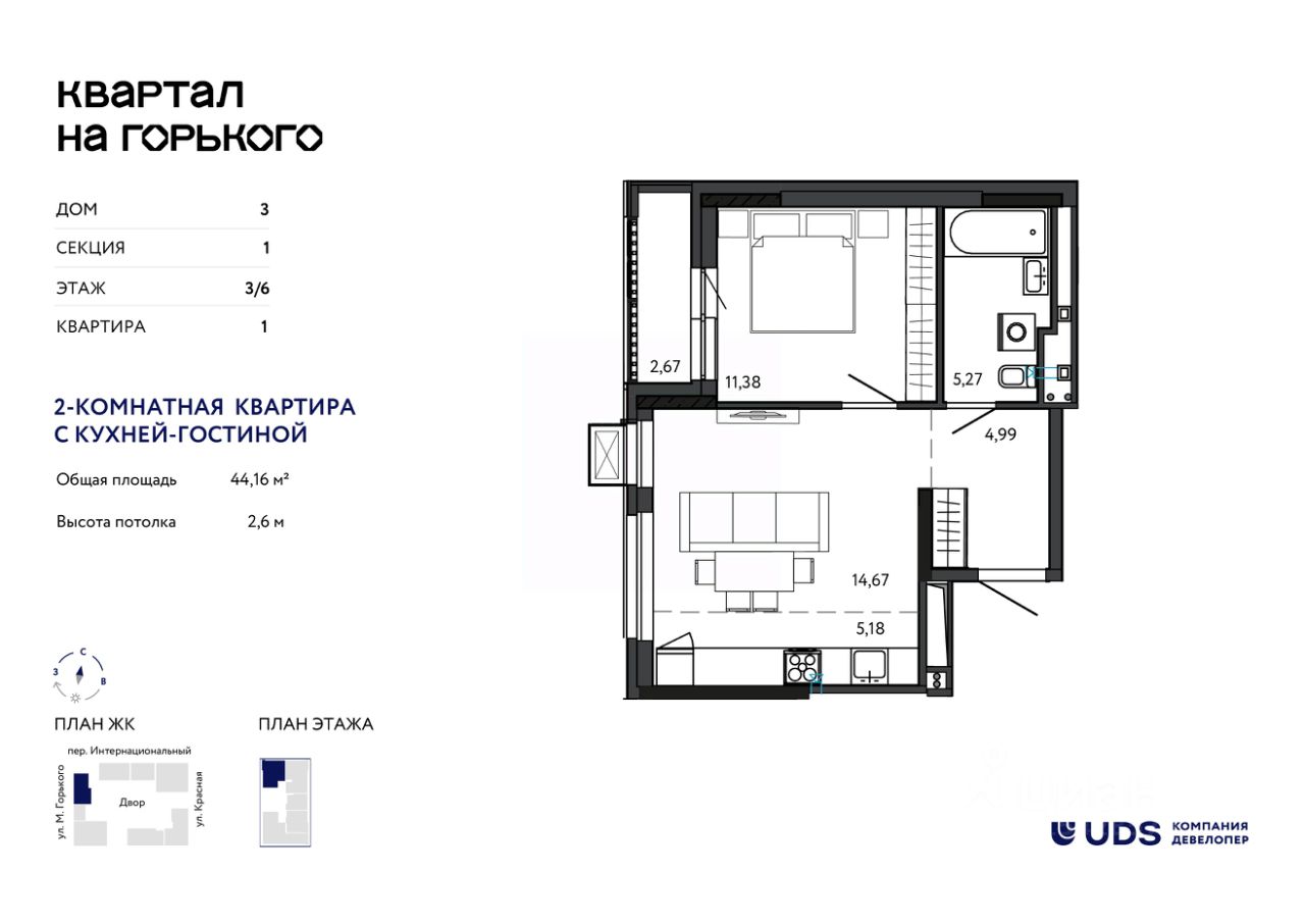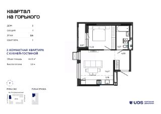 Продаётся 2-комнатная квартира с кухней-гостиной от девелопера UDS в ЖК "Квартал на Горького", дом 3, секция 1, на 3 этаже.