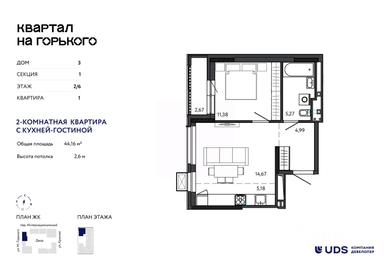 Продаётся 2-комнатная квартира с кухней-гостиной от девелопера UDS в ЖК "Квартал на Горького", дом 3, секция 1, на 2 этаже.