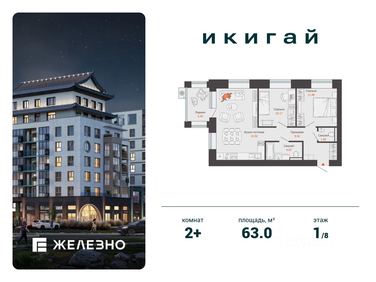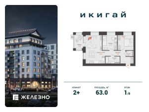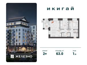 Продается 2-комнатная квартира площадью 63.00 кв. м с предчистовой отделкой. Квартира находится в жилом комплексе комфорт+ "Икигай" от федерального девелопера "Железно".