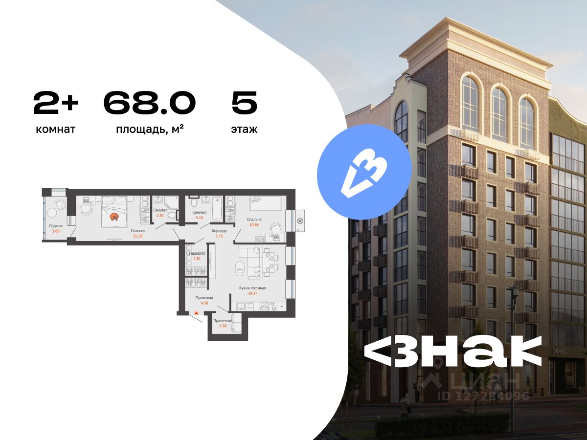 В новом жилом комплексе комфорт-класса "Знак" продается 2-комнатная квартира площадью 68.00 кв. м с отделкой white box. Квартира находится на 5 этаже 7-этажного корпуса 1. Девелопер проекта - федеральный застройщик "Железно".