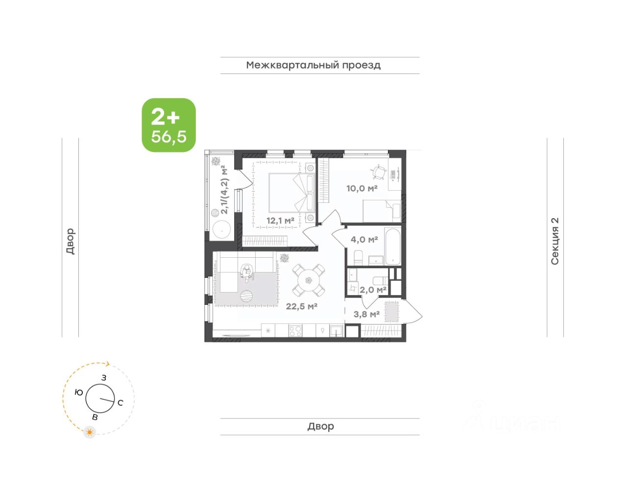 Двухкомнатная квартира с двумя санузлами и просторной кухней-гостиной для семьи. Общая площадь 56,5 кв.м. с двумя отдельными спальнями и двумя санузлами — подходящий вариант для семьи с ребенком. Потолки 2,7 м. Кухня гостиная 22,5 м² — удобное место для готовки, общения и ужинов за столом на четверых. Две изолированные спальни. Два санузла, в одном из которых предусмотрено место под стиральную машину. Лоджия — дополнение к жилому пространству: для отдыха или сезонного хранения. Квартира, в которой продумано все для удобства и семейного уюта.