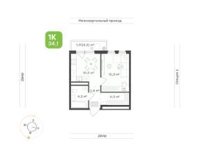 Площадь 34,1 кв.м. с удобной планировкой: отдельная спальня, кухня и дополнительное место для хранения.