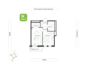 Площадь 34 кв.м. с классической планировкой: изолированная спальня и кухня.