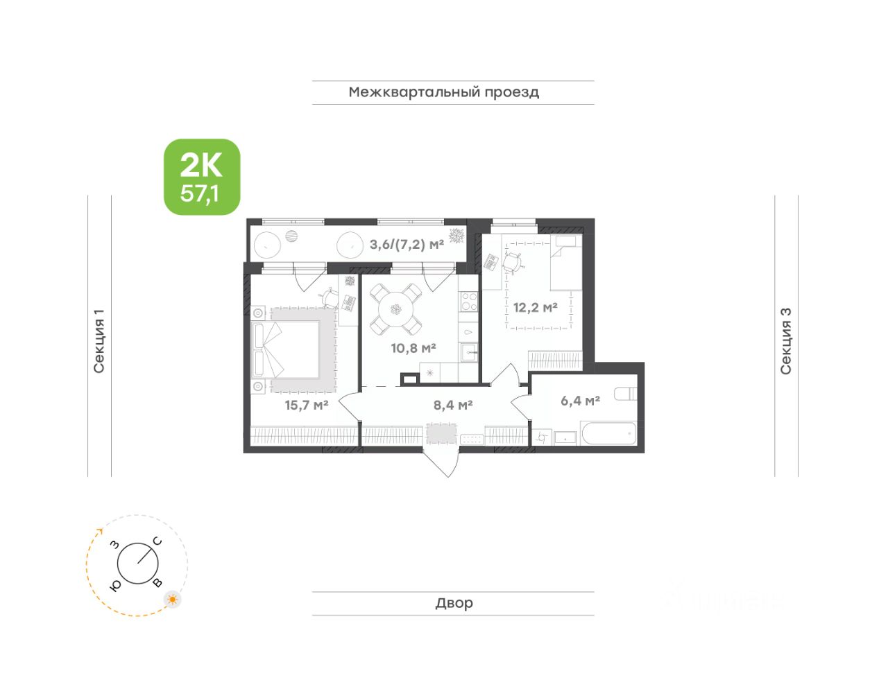 Общая площадь 57,1 кв.м. с двумя изолированными комнатами и отдельной кухней.