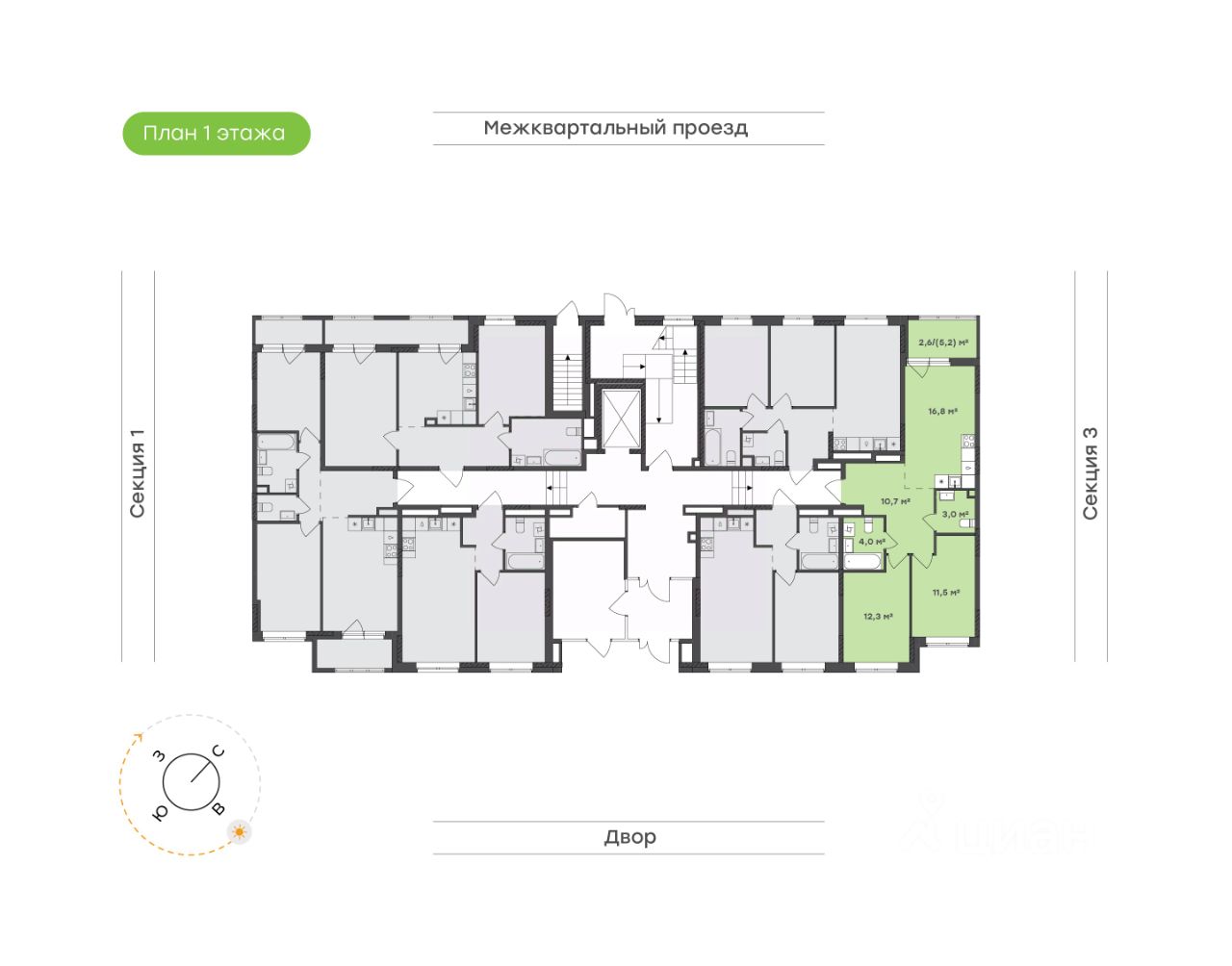 Просторная евро-планировка с окнами на две стороны света — идеальное решение для семьи, ценящей свет и пространство.