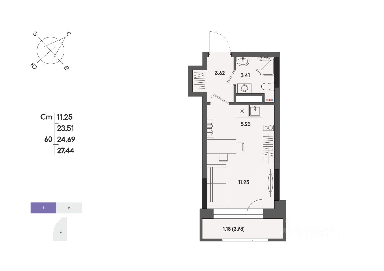 Общая площадь24,69 м²