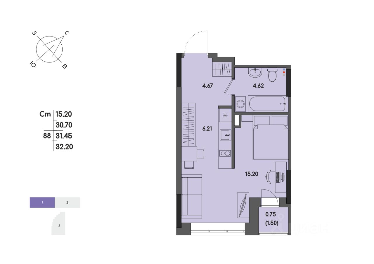 Общая площадь31,45 м²