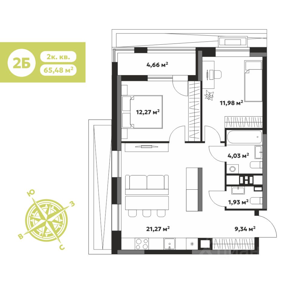 Продаётся 2-комнатная квартира в строящемся доме (2 этап), срок сдачи: I-кв. 2028, общей площадью 65.48 кв.м., на 2 этаже.