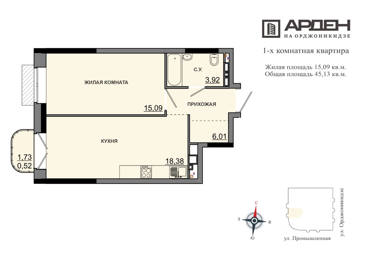 Продаётся 1-комнатная квартира в строящемся доме (дом 54), срок сдачи: II-кв. 2028, общей площадью 43.92 кв.м., на 5 этаже. Новый жилой комплекс "Арден на Орджоникидзе" от застройщика ГК "Арден" расположен по адресу: Удмуртская Республика, Ижевск, улица Гольянский посёлок, 54