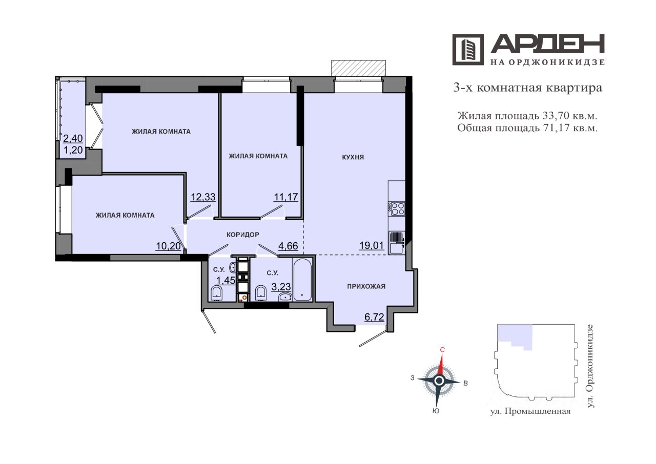 Продаётся 3-комнатная квартира в строящемся доме (дом 54), срок сдачи: II-кв. 2028, общей площадью 69.97 кв.м., на 6 этаже. Новый жилой комплекс "Арден на Орджоникидзе" от застройщика ГК "Арден" расположен по адресу: Удмуртская Республика, Ижевск, улица Гольянский посёлок, 54