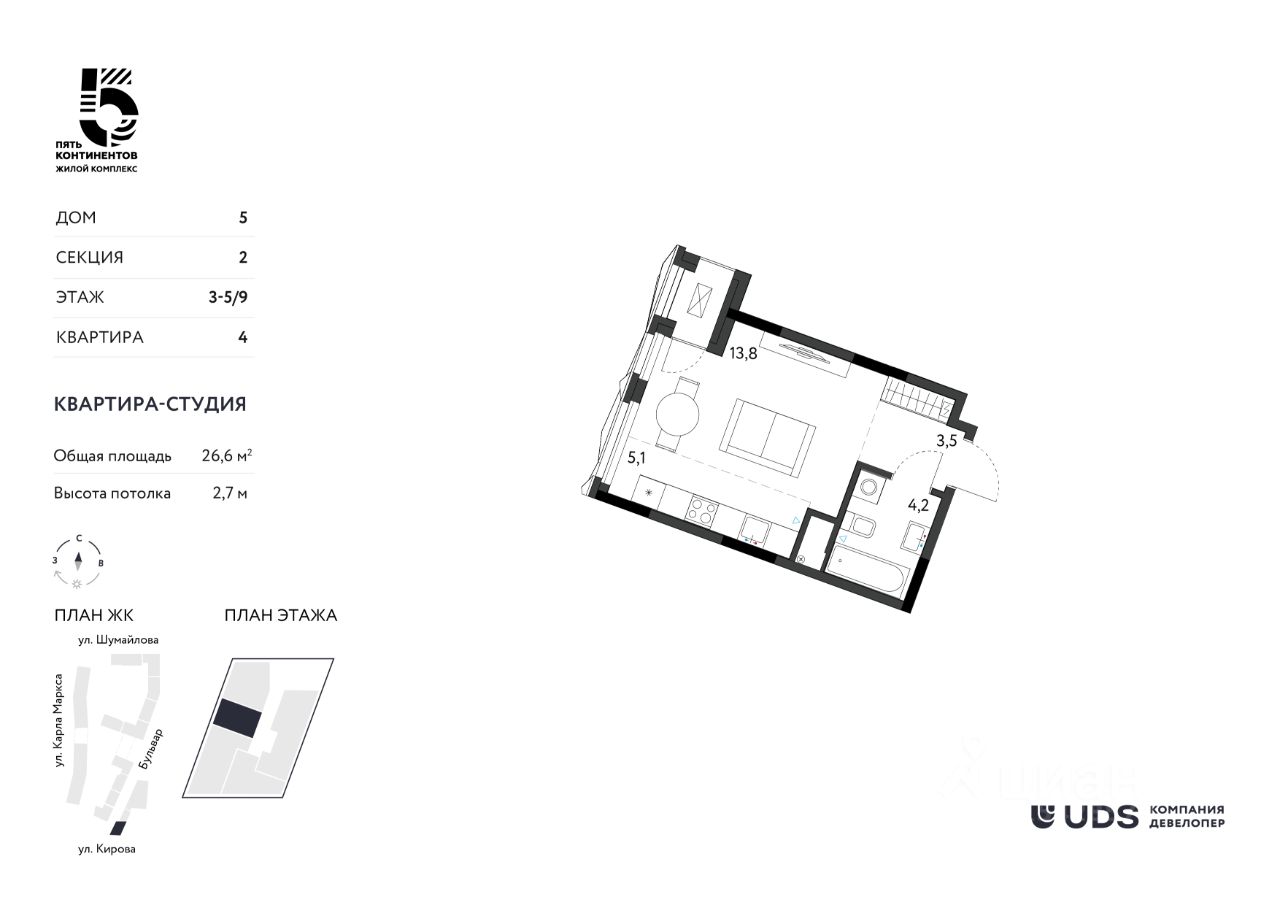 СТАРТ ПРОДАЖ! Успейте забронировать квартиру по ценам 2025 года в финальном доме ЖК "Пять континентов". Живите в центре! Квартиры в топовой локации Ижевска, где всё действительно рядом. • 15 минут пешком до набережной и Центральной площади • Новый пешеходный бульвар вдоль домов — комфортное пространство для прогулок и встреч • Школы, детские сады и работа — в шаговой доступности • Все виды общественного транспорта рядом Финальный дом жилого комплекса Состоит из двух секций переменной этажности — от 9 до 23 этажей. • Просторные кухни-гостиные • Мастер-спальни с собственной душевой • Закрытая территория и видеонаблюдение 24/7 • Двухуровневый подземный паркинг • Индивидуальные кладовые • Тихий и безопасный внутренний двор Внутри комплекса — спокойствие и безопасность, за его пределами — динамика центрального района. Новый район CITY: престижные дома и культурное окружение вокруг. Жильё в центре — надёжный ликвид и уверенность в будущем. Выбирайте ЖК "Пять континентов" для жизни и инвестиций.
