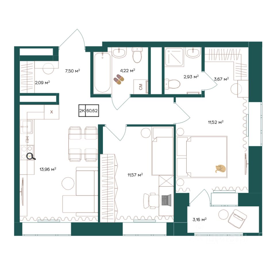 60,62 м²