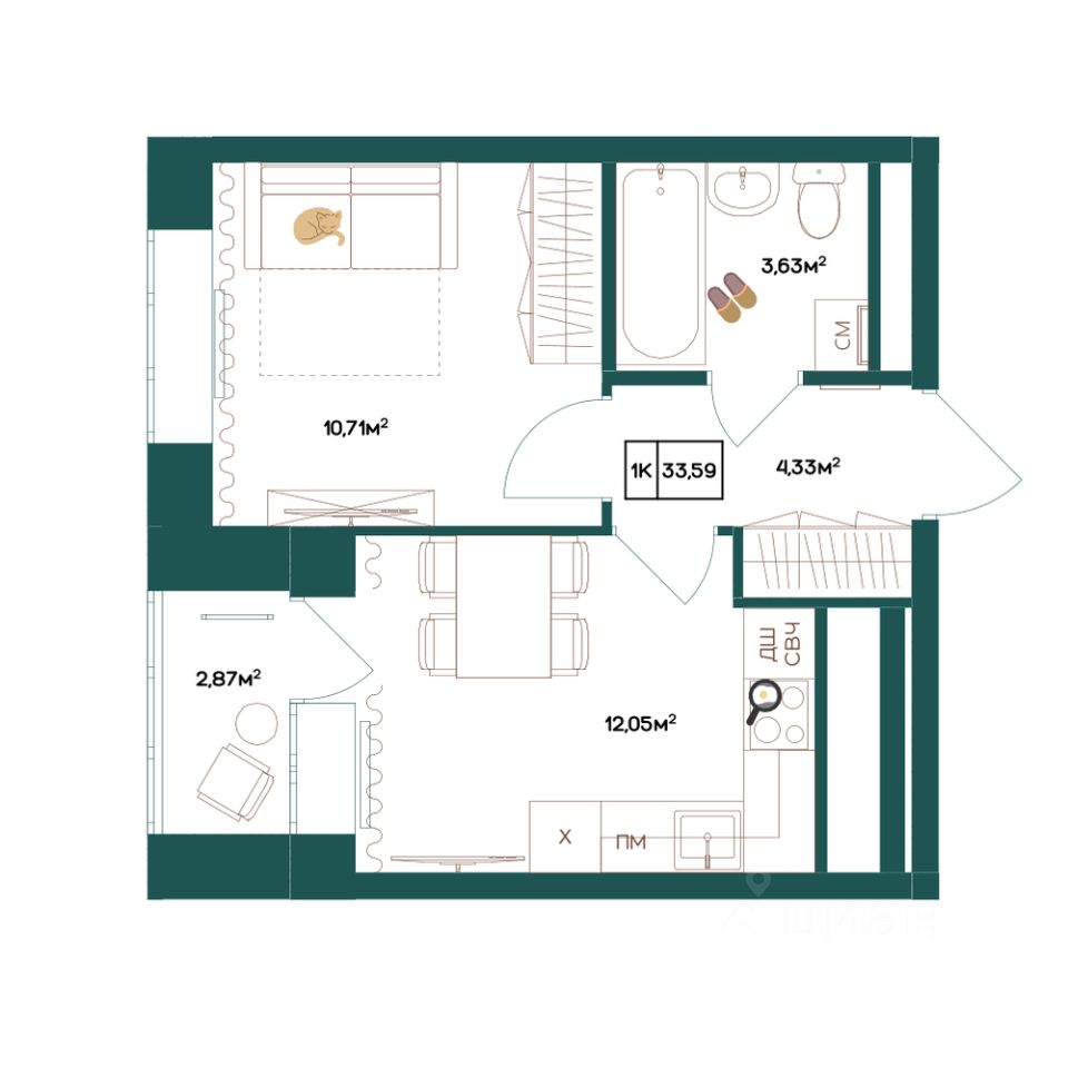 33,55 м²