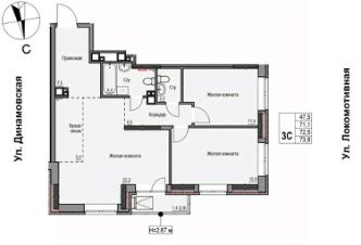 Продаётся 3-комнатная квартира в строящемся доме (Дом 1), срок сдачи: II-кв. 2027, общей площадью 72.5 кв.м., на 5 этаже. ЖК "Локомотив" - это жилой комплекс, состоящий из трех домов, объединенных стилобатом. Удобное расположение, 15 минут до центра.