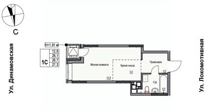 Продаётся 1-комнатная квартира в строящемся доме (Дом 1), срок сдачи: II-кв. 2027, общей площадью 26.7 кв.м., на 7 этаже. ЖК "Локомотив" - это жилой комплекс, состоящий из трех домов, объединенных стилобатом. Удобное расположение, 15 минут до центра.