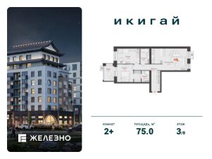 Продается 2-комнатная квартира площадью 75.00 кв. м с предчистовой отделкой. Квартира находится в жилом комплексе комфорт+ "Икигай" от федерального девелопера "Железно".