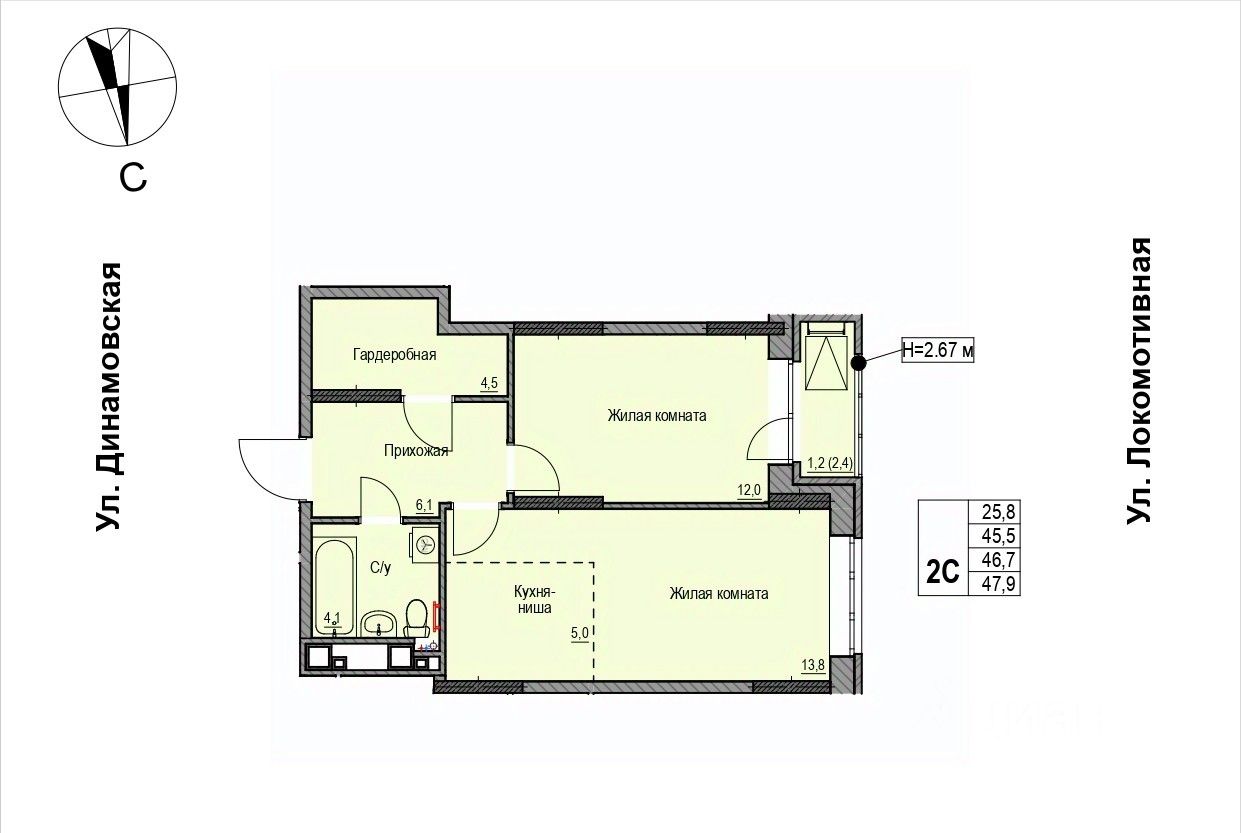 Продаётся 2-комнатная квартира в строящемся доме (Дом 2), срок сдачи: II-кв. 2028, общей площадью 46.7 кв.м., на 7 этаже. ЖК "Локомотив" - это жилой комплекс, состоящий из трех домов, объединенных стилобатом. Удобное расположение, 15 минут до центра.