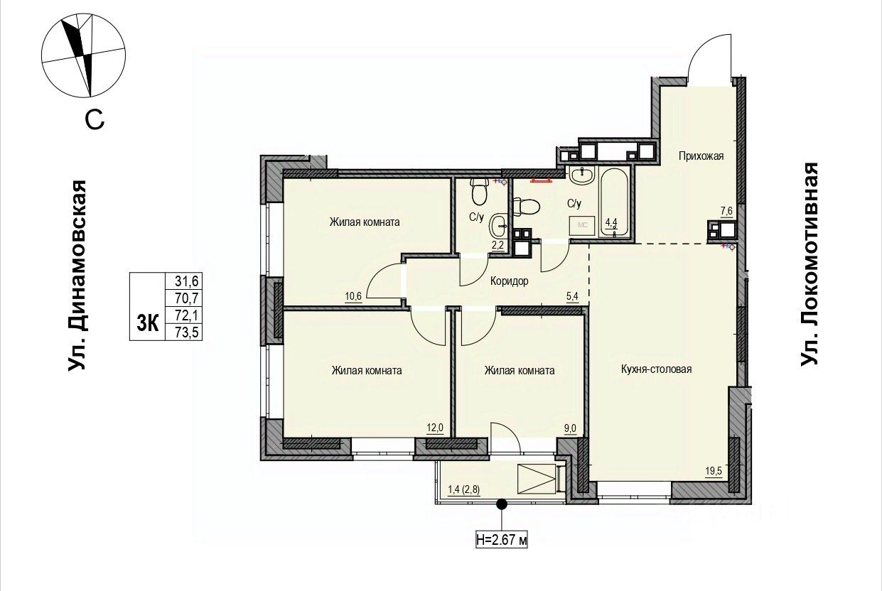 Продаётся 3-комнатная квартира в строящемся доме (Дом 2), срок сдачи: II-кв. 2028, общей площадью 72.1 кв.м., на 9 этаже. ЖК "Локомотив" - это жилой комплекс, состоящий из трех домов, объединенных стилобатом. Удобное расположение, 15 минут до центра.