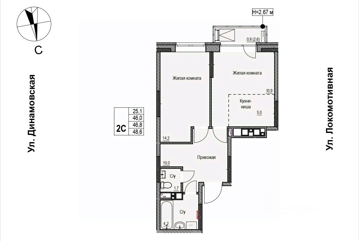 Продаётся 2-комнатная квартира в строящемся доме (Дом 2), срок сдачи: II-кв. 2028, общей площадью 46.8 кв.м., на 9 этаже. ЖК "Локомотив" - это жилой комплекс, состоящий из трех домов, объединенных стилобатом. Удобное расположение, 15 минут до центра.