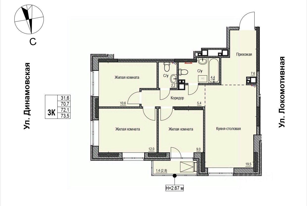 Продаётся 3-комнатная квартира в строящемся доме (Дом 2), срок сдачи: II-кв. 2028, общей площадью 71.8 кв.м., на 12 этаже. ЖК "Локомотив" - это жилой комплекс, состоящий из трех домов, объединенных стилобатом. Удобное расположение, 15 минут до центра.