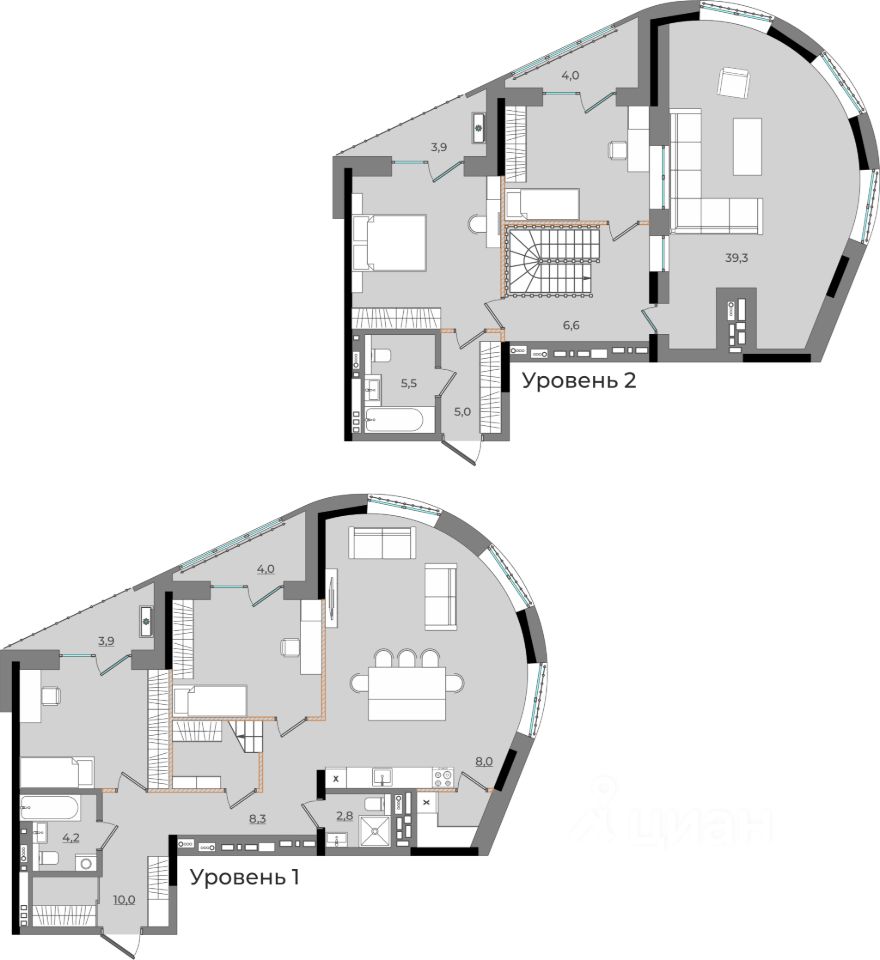 Восьмой дом-квартал состоит из четырех корпусов, расположенных на стилобате — общем первом этаже дома, на котором располагается двор. Внутри стилобата — двухуровневый паркинг, кладовые и коммерческие помещения. Каждый корпус имеет свой характер. Совсем, как люди, которые будут жить в них.