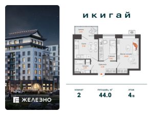 Продается 2-комнатная квартира площадью 44.00 кв. м с предчистовой отделкой. Квартира находится в жилом комплексе комфорт+ "Икигай" от федерального девелопера "Железно".