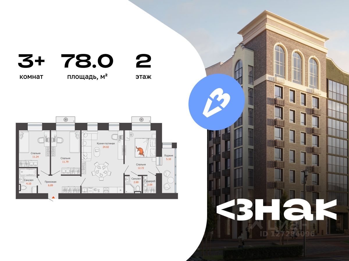 В новом жилом комплексе комфорт-класса "Знак" продается 3-комнатная квартира площадью 78.00 кв. м с отделкой white box. Квартира находится на 2 этаже 7-этажного корпуса 1. Девелопер проекта - федеральный застройщик "Железно".