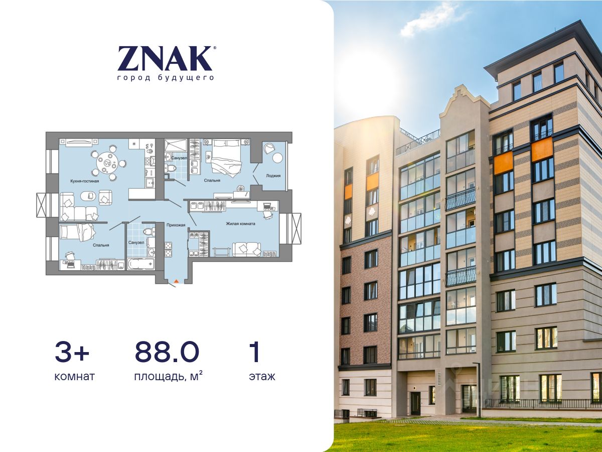 Продается 3-комнатная квартира площадью 88.00 кв. м. с предчистовой отделкой. Квартира находится в жилом комплексе комфорт-класса ZNAK, расположенном в районе ул. Берша.