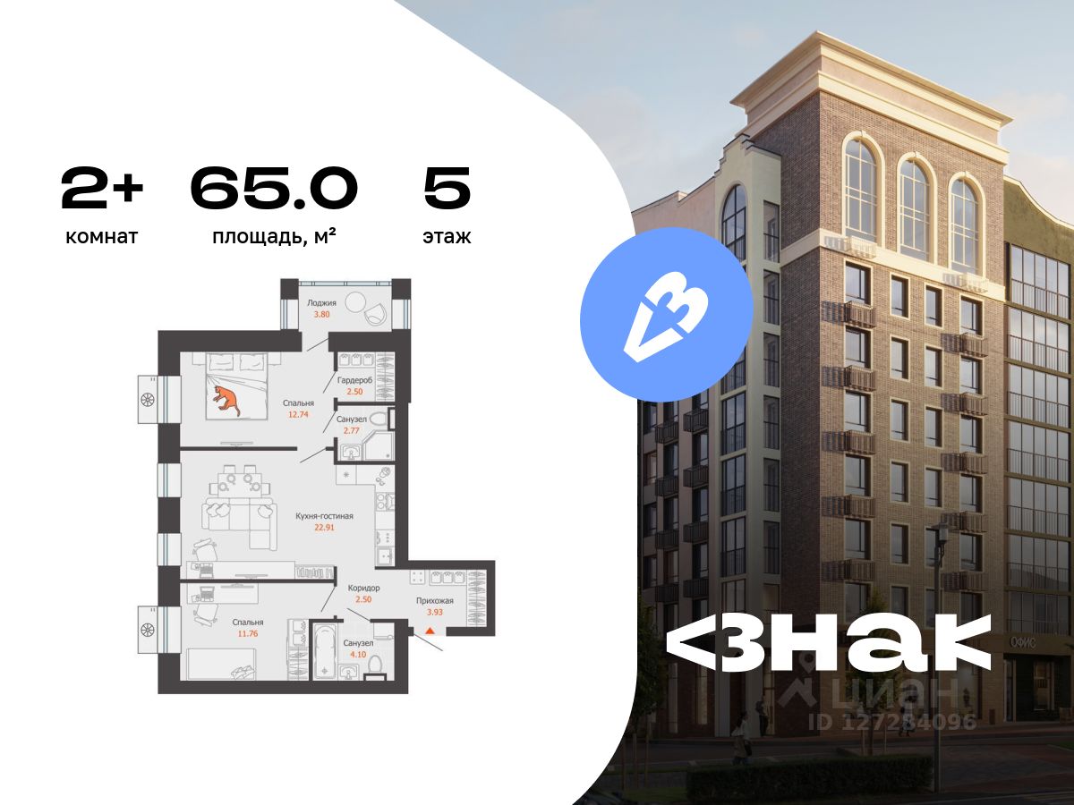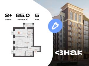 В новом жилом комплексе комфорт-класса "Знак" продается 2-комнатная квартира площадью 65.00 кв. м с отделкой white box. Квартира находится на 5 этаже 8-этажного корпуса 1. Девелопер проекта - федеральный застройщик "Железно".