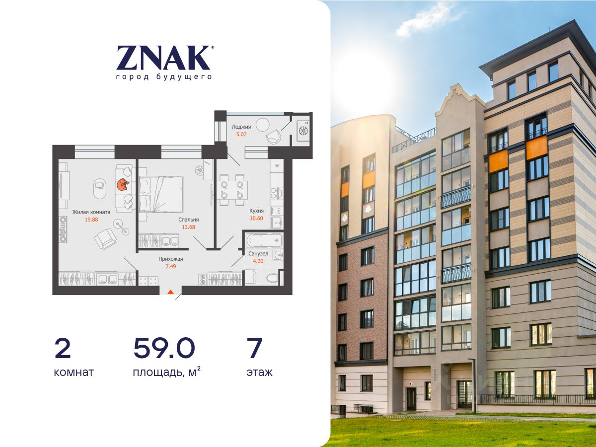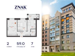 Продается 2-комнатная квартира площадью 59.00 кв. м. с предчистовой отделкой. Квартира находится в жилом комплексе комфорт-класса ZNAK, расположенном в районе ул. Берша.