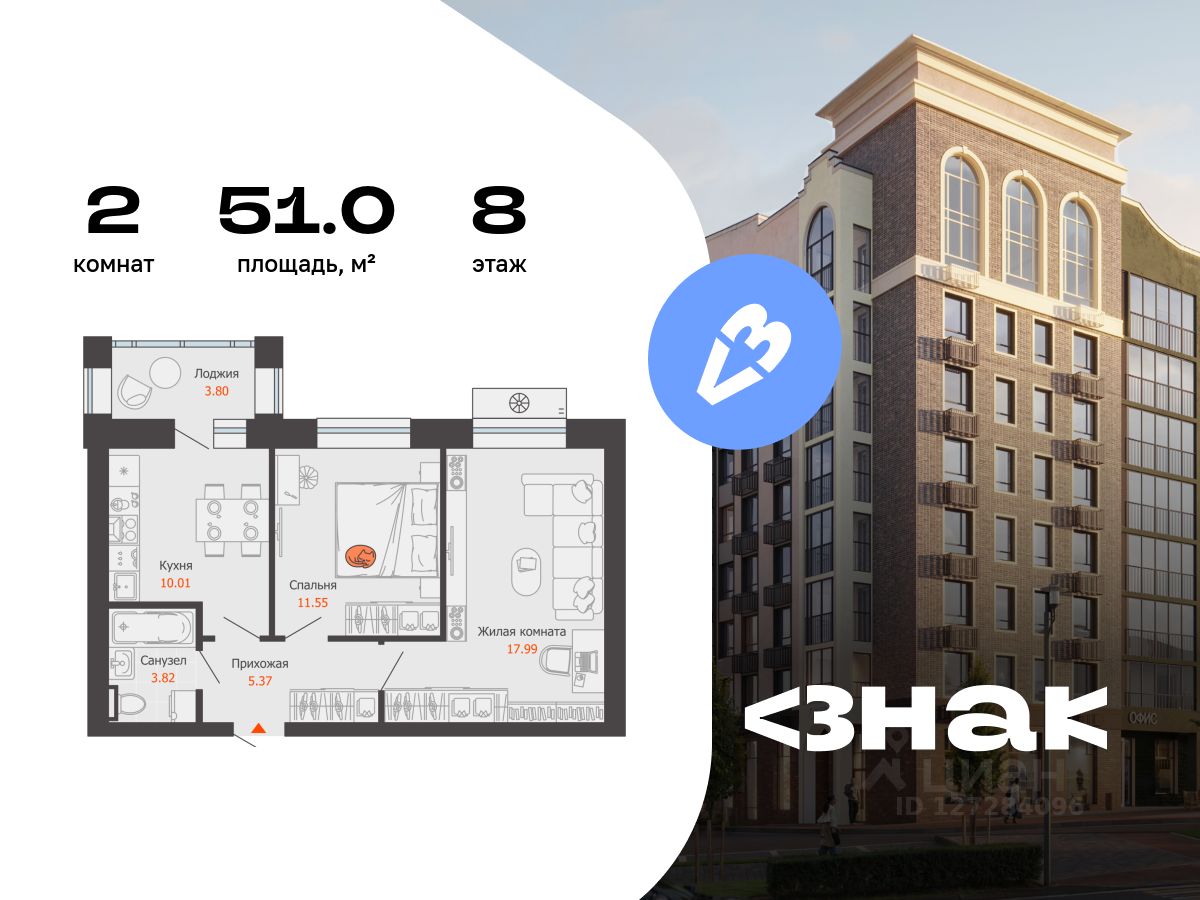 В новом жилом комплексе комфорт-класса "Знак" продается 2-комнатная квартира площадью 51.00 кв. м с отделкой white box. Квартира находится на 8 этаже 8-этажного корпуса 1. Девелопер проекта - федеральный застройщик "Железно".