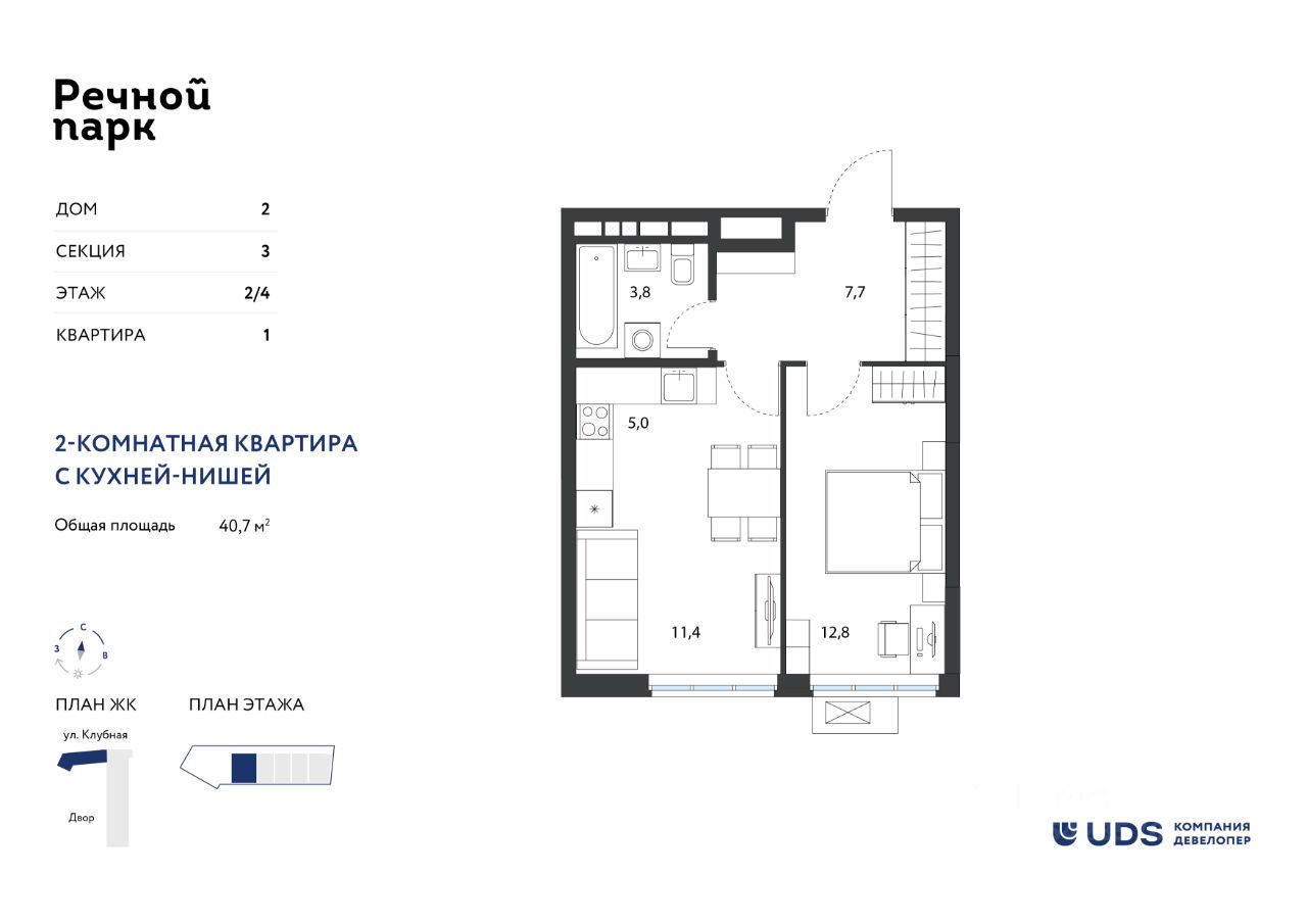 Двухкомнатная квартира евро-планировки в 4-этажной секции ЖК "Речной парк" дом 2.