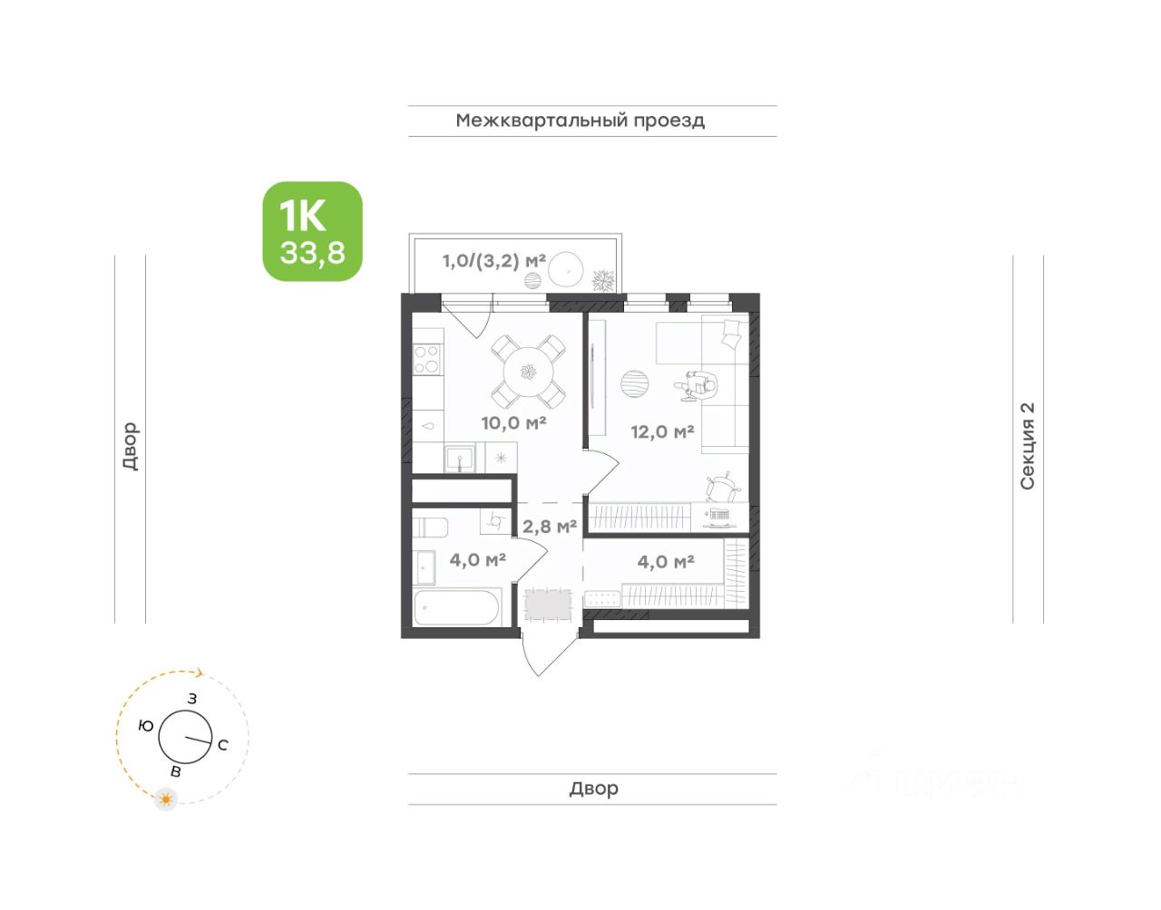 Площадь 33,8 кв.м. с удобной планировкой: отдельная спальня, кухня и дополнительное место для хранения.