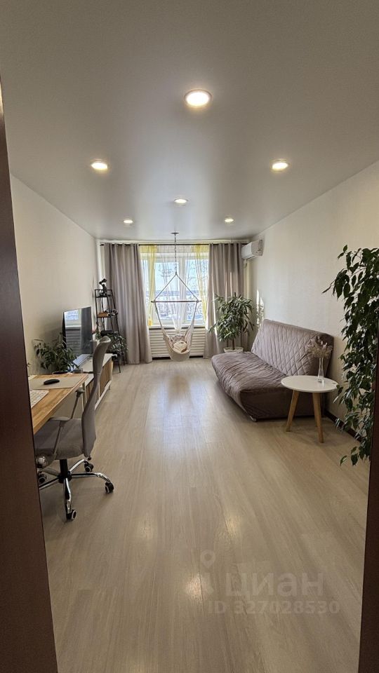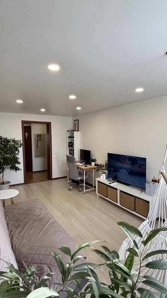 В квартире сейчас проживают, поэтому на фотографиях она полностью обустроена. При продаже остаётся кухонный гарнитур, кондиционер в гостиной и большой встроенный шкаф-купе в комнате.