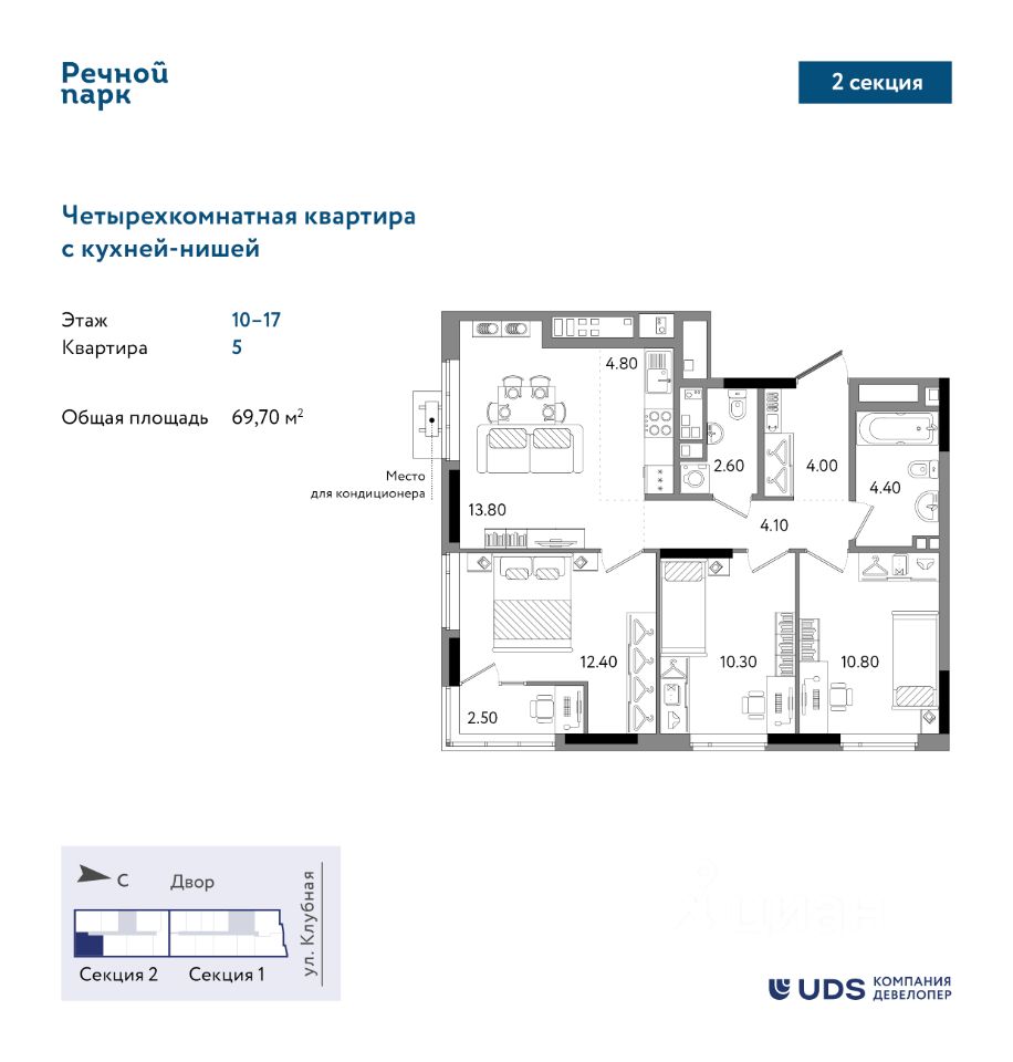 Четырехкомнатная квартира евро-планировки в 25-этажной секции ЖК ""Речной парк" дом 2. Выходит на 2 стороны света, окна на юг и восток. Кухня-гостиная почти 19 м2, правильной формы - здесь удобно расположить и кухонный гарнитур, и зону гостиной с диваном и обеденным столом. 3 отдельные спальни, в каждой запланировано место для вместительного шкафа. В одной из комнат - выход на теплую остекленную лоджи. В квартире 2 санузла, в одном из них можно установить стиральную машину. В прихожей грязная зона отделена от жилой части квартиры, есть ниша для шкафа под уличную одежду и обувь. Квартира светлая - увеличенные оконные проемы, уровень подоконника 60 см от пола, высота окна 1,7 м. При покупке недвижимости в домах UDS вы получаете в подарок 6 или 12 месяцев дополнительного сервиса отельного уровня. В зависимости от пакета в программу входит: масштабная уборка после ремонта, генеральная и регулярная поддерживающая уборка, химчистка мебели, мойка окон, глажка вещей, личный шеф-повар на праздник. Наслаждайтесь жизнью в новой квартире с первого дня и не думайте о бытовых вопросах.