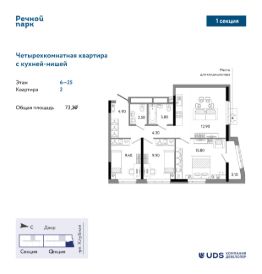 Четырехкомнатная квартира евро-планировки в 25-этажной секции ЖК ""Речной парк" дом 2. Выходит на 2 стороны света, окна на север и восток, вид на ул. Клубная и город, а с верхних этажей на теплой лоджии открывается красивый вид на закат и панорама Ижевского пруда. Кухня-гостиная почти 20 м2, правильной формы - здесь удобно расположить и кухонный гарнитур, и зону гостиной с диваном и обеденным столом. 3 отдельные спальни, в каждой запланировано место для вместительного шкафа. 2 санузла, в одном из них можно установить стиральную машину. Прихожая просторная, грязная зона отделена от жилой части квартиры, достаточно места для шкафа под уличную одежду и обувь.