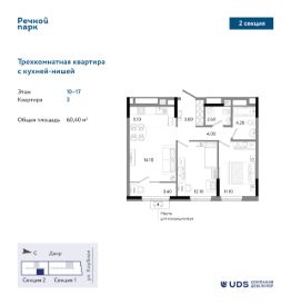 Трехкомнатная квартира евро-планировки в 25-этажной секции ЖК "Речной парк", дом 2. Кухня-гостиная 19 м2 правильной прямоугольной формы с выходом на остекленную теплую лоджию. 2 отдельные спальни, в которых можно разместить всю необходимую мебель и эргономично распланировать пространство. В квартире 2 санузла, в одном из них можно поставить стиральную машину. Грязная зона прихожей отделена от жилой части, для уличной одежды и обуви предусмотрена ниша для шкафа под верхнюю одежду и обувь.