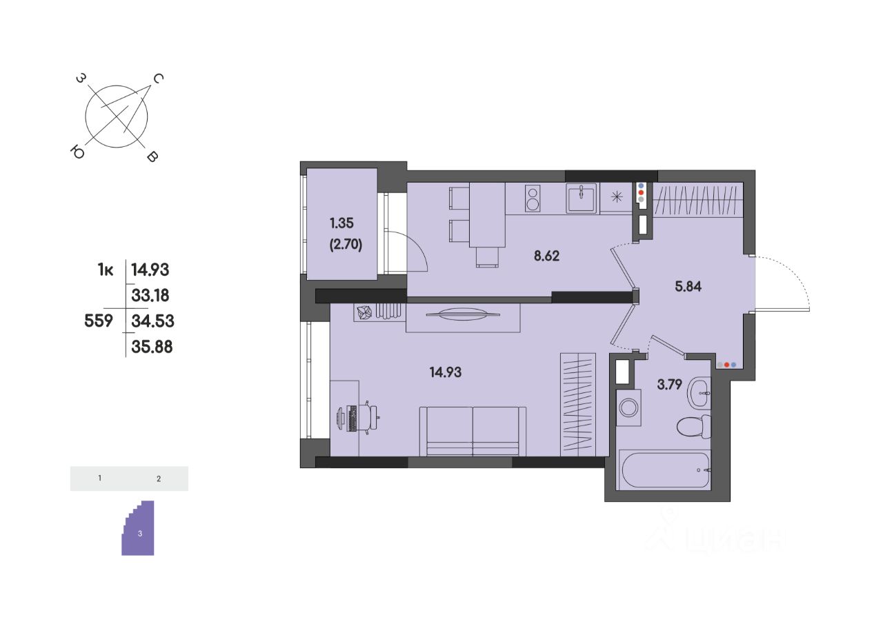 Общая площадь34,53 м²