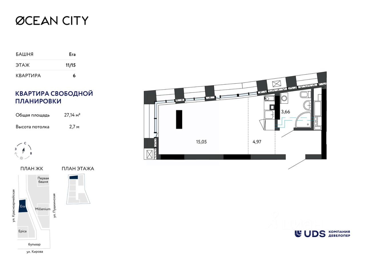 Лучший жилой небоскреб. Самый высокий дом в Ижевске, который видно даже с самолета. OCEAN CITY (ЖК Оушен сити) - для тех, кто хочет жить на высоте и ценит статус. Панорамные виды из окон, которые будут всегда с вами. Неземной двор на высоте 8 метров - эксклюзивная приватная территория только для резидентов OCEAN CITY (ЖК Оушен сити). Зоны отдыха, дизайнерские детские площадки, open-air тренажеры. 10 000 м² пешеходного бульвара "ОКЕАН" — стильное продолжение вашего пространства. Вечерние променады, уютные кафе, живая атмосфера — дорога домой превратиться в удовольствие. Бутиковый ритейл у вас под ногами — кофейни, рестораны, spa-салоны, премиальные магазины. На массаж и за кофе в тапочках, не выходя на улицу. Технологии комфорта нового поколения: Бесключевой доступ — дом распознаёт вас автоматически. Премиальные высокоскоростные лифты с увеличенными потолками — перемещения в стиле CITY. Свободные планировки — воплотите любую дизайн концепцию без границ. Панорамное остекление с интегрированным климат-контролем — идеальный микроклимат без компромиссов. Тёплый подземный паркинг 24/7 — ваш автомобиль в безопасности в любое время года. Инвестиция в престижную недвижимость — OCEAN CITY (ЖК ОКЕАН сити) не просто жильё, а актив, который будет расти в цене. При покупке недвижимости в домах UDS вы получаете в подарок 6 или 12 месяцев дополнительного сервиса отельного уровня. В зависимости от пакета в программу входит: масштабная уборка после ремонта, генеральная и регулярная поддерживающая уборка, химчистка мебели, мойка окон, глажка вещей, личный шеф-повар на праздник. Наслаждайтесь жизнью в новой квартире с первого дня и не думайте о бытовых вопросах.