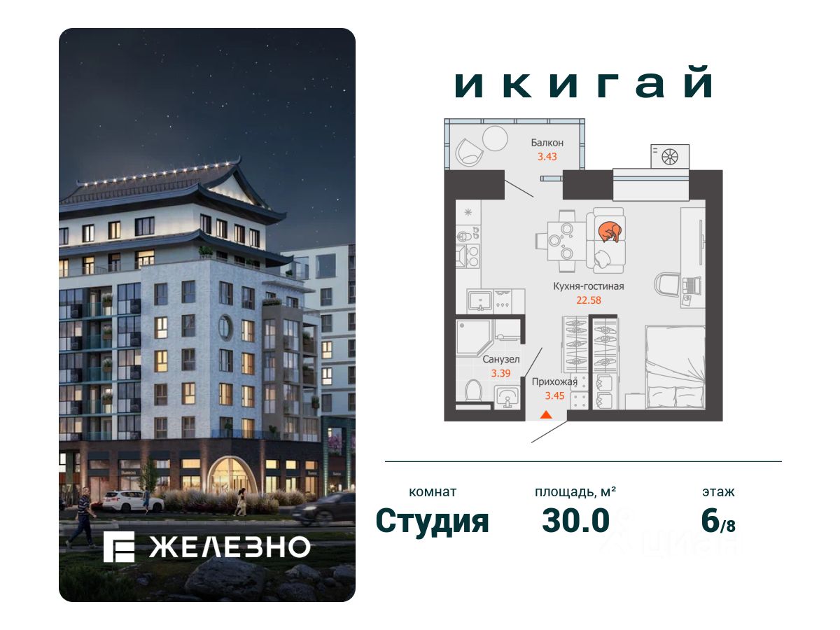 Продается студия площадью 30.00 кв. м с предчистовой отделкой. Квартира находится в жилом комплексе комфорт+ "Икигай" от федерального девелопера "Железно".