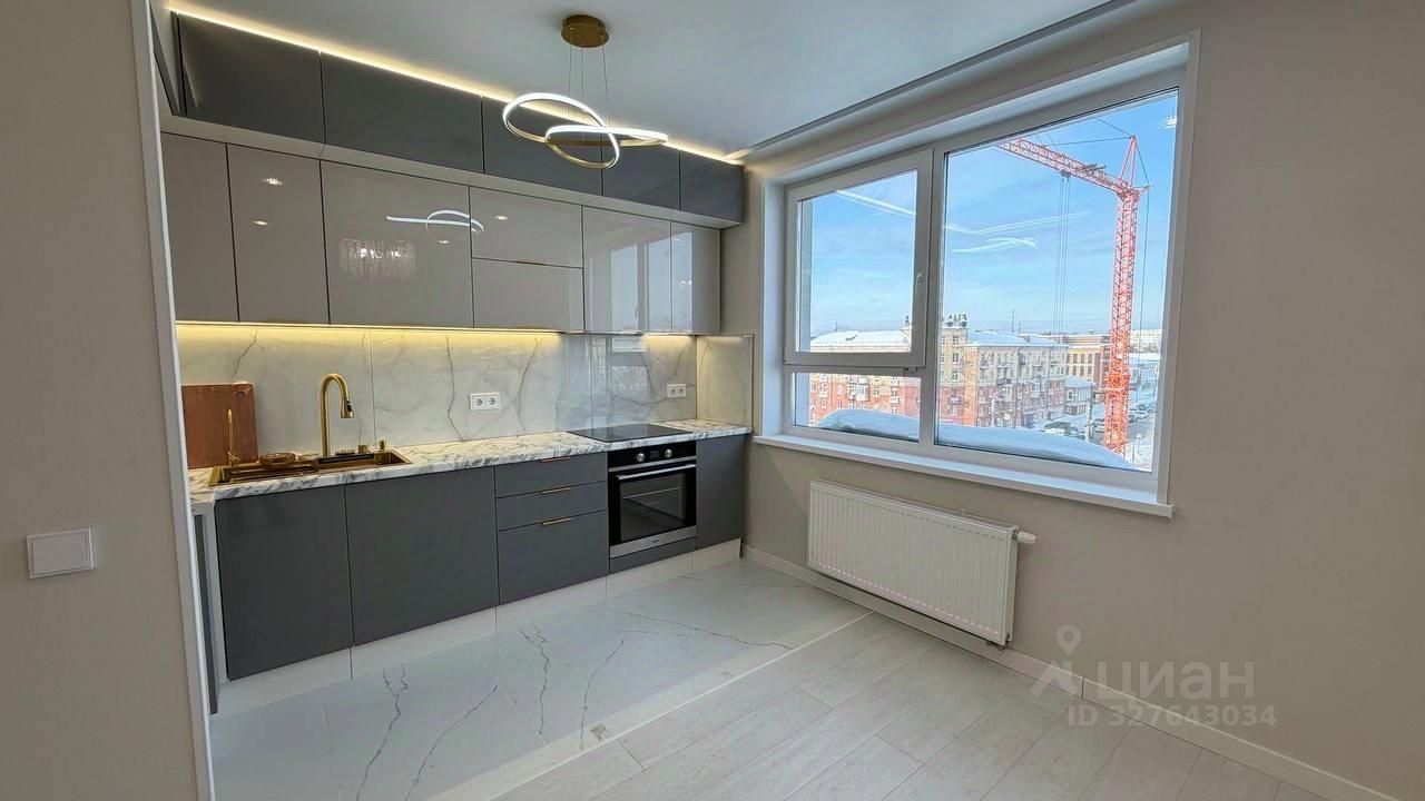 Большая кухня-гостиная, уже оборудованная готовым кухонным гарнитуром со встроенной техникой, из гостиной открывается прекрасный вид на ул. М. Горького.