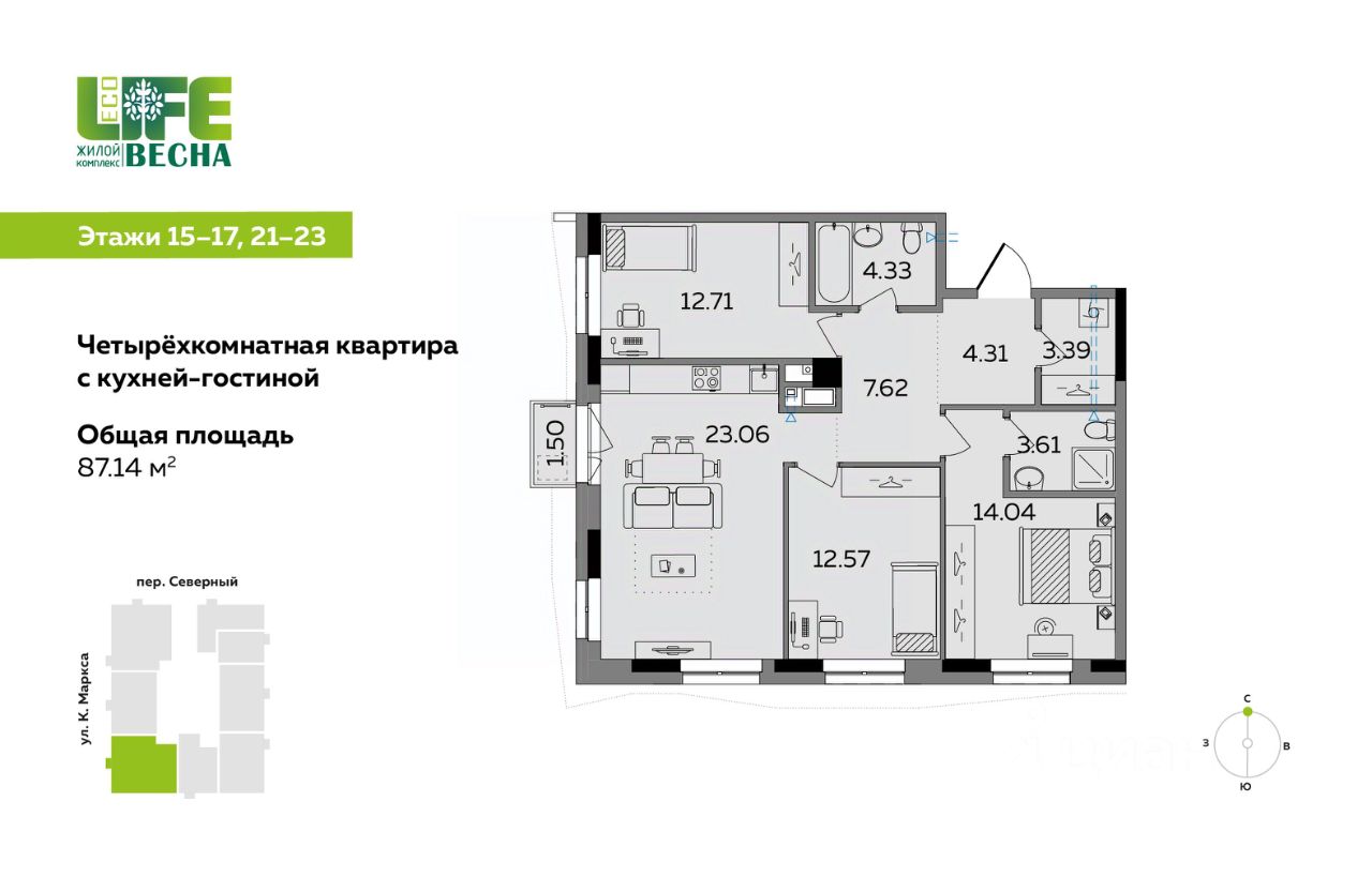 Продаётся 4-комнатная квартира с кухней-гостиной от застройщика в ЖК ECO Life Весна, дом 3. Площадь — 87,14 м². Дом бизнес-класса в центре Ижевска, рядом с администрацией города. Удобная планировка для большой семьи: • Кухня-гостиная 23 м² — центр семейных встреч и отдыха. • Три отдельные спальни 14,0 / 12,6 / 12,7 м² — комфорт для детей и родителей. • Два санузла — удобно для большой семьи и гостей. • Гардеробная и кладовая — порядок в доме без лишней мебели. • Окна на разные стороны света — много дневного света и свежего воздуха. Двор без машин, экопарк 1 гектар Рядом есть всё для развития и экономии времени на поездки: детские сады 235, 189, 287, 241, 73, школы 5, 88, 11, 27, частные школы Sok, Nova, развивающие центры Маленький гений, Сова, Знайка, АБВГД+, Tocky Talky, Cherry-Pick, Оранжевый лев, Монтессори дворик, Слушарики Магазины, кафе и салоны красоты — в комплексе; Подземный паркинг, наземная стоянка и охрана 24/7 Сервисы отеля у вас дома. Проводите время с родными, стройте карьеру мы возьмем на себя бытовые хлопоты: от регулярной уборки до химчистки мебели. Переходите на новый уровень жизни! Четыре дома комплекса уже сданы, и в них счастливо живут семьи. Успейте приобрести квартиру мечты в последнем доме комплекса ECO Life Весна! ecolife, жк eco life весна, жк эко лайф ижевск, жк эколайф, жк эколайф весна ижевск, жк эколайф ижевск, эко лайф ижевск, эколайф, Эко лайф, Эколайф, Eco Life, EcoLife